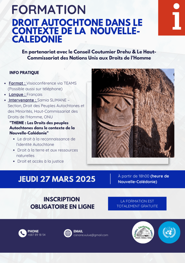| Date: Thursday, March 27, 2025 Time: Starting at 6:00 PM (New Caledonia time) Format: Videoconference via TEAMS (Possible via phone – remember to download the app) Language: French Speakers: Viro XULUE & Samia SLIMANE – Indigenous Peoples’ and Minority Rights Section, Office of the High Commissioner for Human Rights, UN |