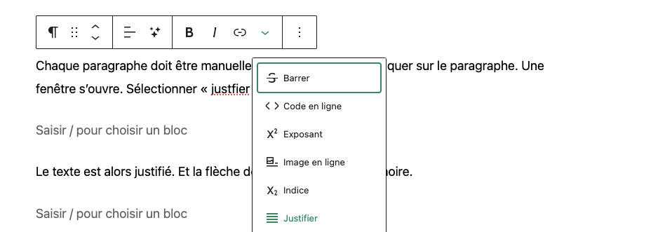 Chaque paragraphe doit être manuellement justifié (aligné). Cliquer sur le paragraphe. Une fenêtre s’ouvre. Sélectionner « justfier ».