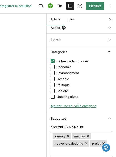 Identifier la catégorie. Entrer les étiquettes (tags) qui permettront d’identifier 3 articles correspondant qui seront en bas de l’article et de simplifier la recherche de l’article sur Google, Ecosia, etc…